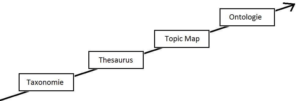 Es gibt verschiedene Ansätze zur Repräsentation von Wissen, deren Mächtigkeit in der Reihenfolge Taxonomie, Thesaurus, Topic Map und Ontologie zunimmt (vgl. Abbildung 1).