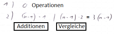 - Erste Überlegung: \(A(n) = (n-1)+(n-2)+…+1 = \sum_{n-1}^{i=1}i=\frac{n*(n-1)}{2}\)