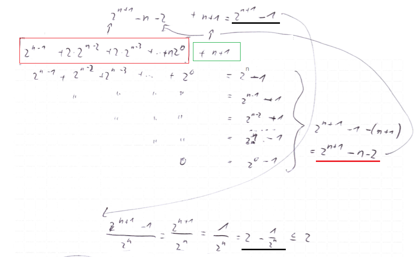 - Daraus ergibt sich: \(V(n) = n+(n-1)+(n-2)+…-1=\sum_{n}^{i=1}\frac{n*(n+1)}{2}-1 \)