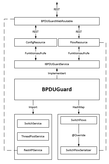 Zum Abschluss habe ich mit einer Implementierung einer zentralisierten BPDU Guard-Funktion begonnen, welche bei der Absicherung des Netzwerks beim Einsatz des Spanning Tree Protocols (STP) gegen STP mangling-Attacken unterstützt. Die folgende Abbildung skizziert den schematischen Aufbau meiner Lösung.