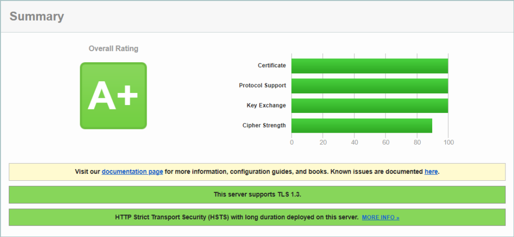 Abschließend kontrollieren wir mithilfe von Qualys den neuen Status und führen einen erneuten Scan durch. Es ergibt sich nun eine Bewertung mit A+ mit voller Bewertung in drei Kategorien.